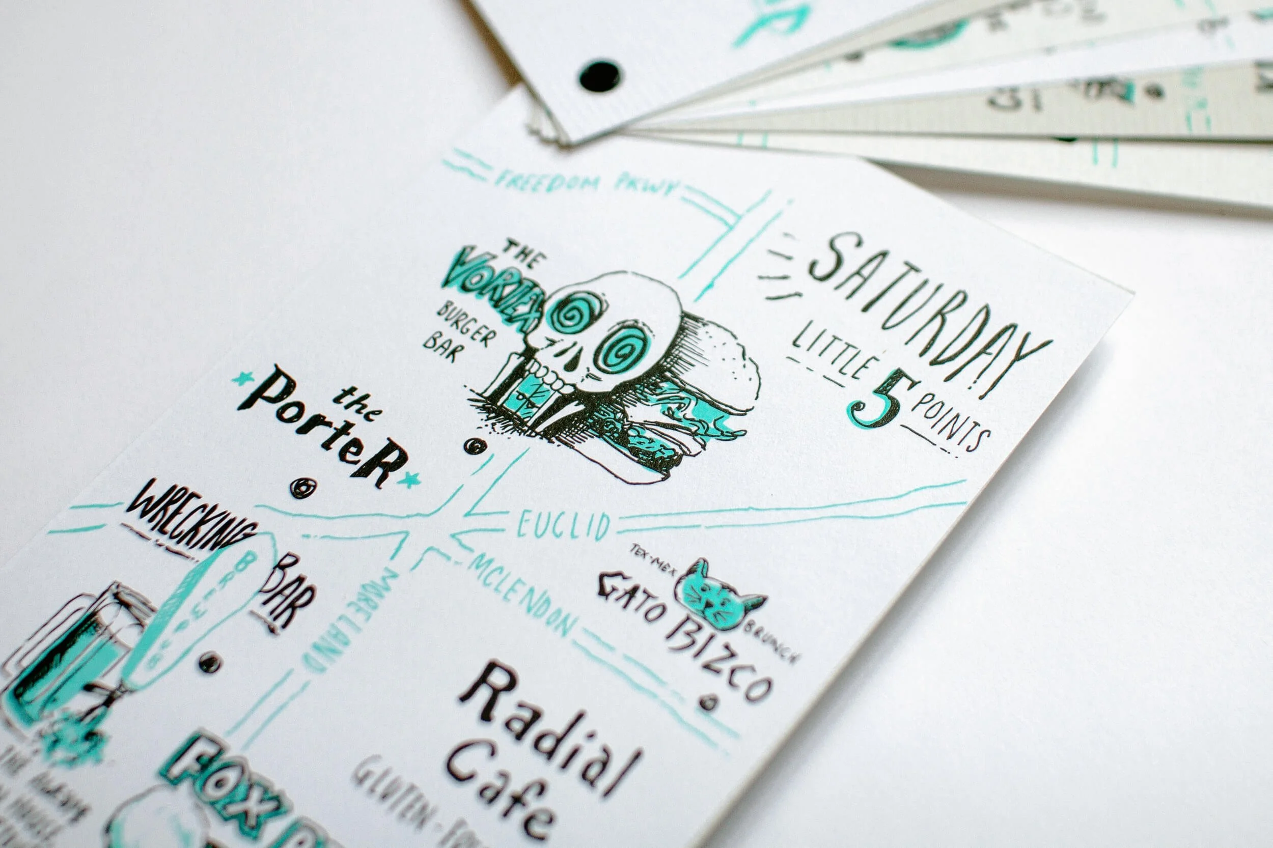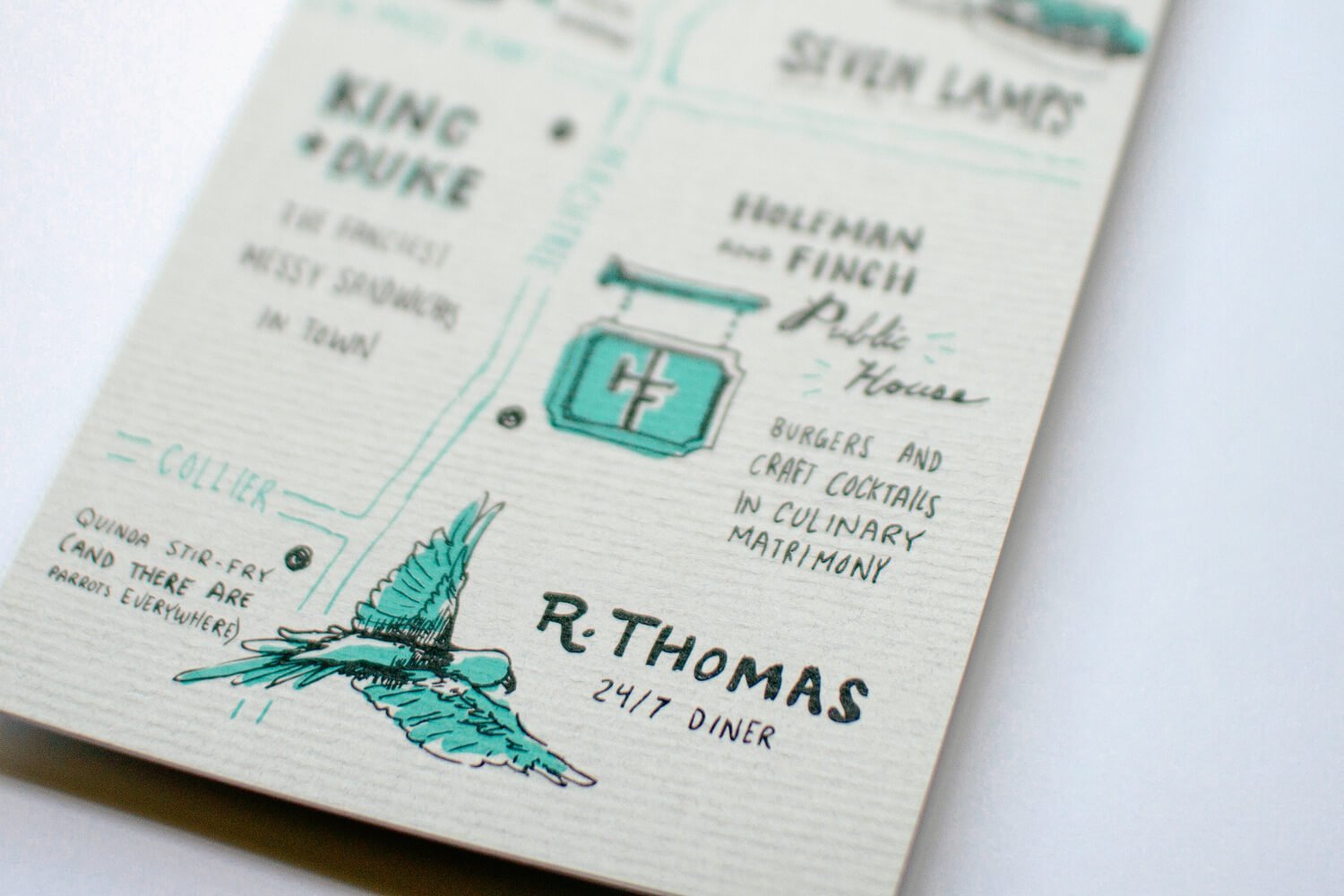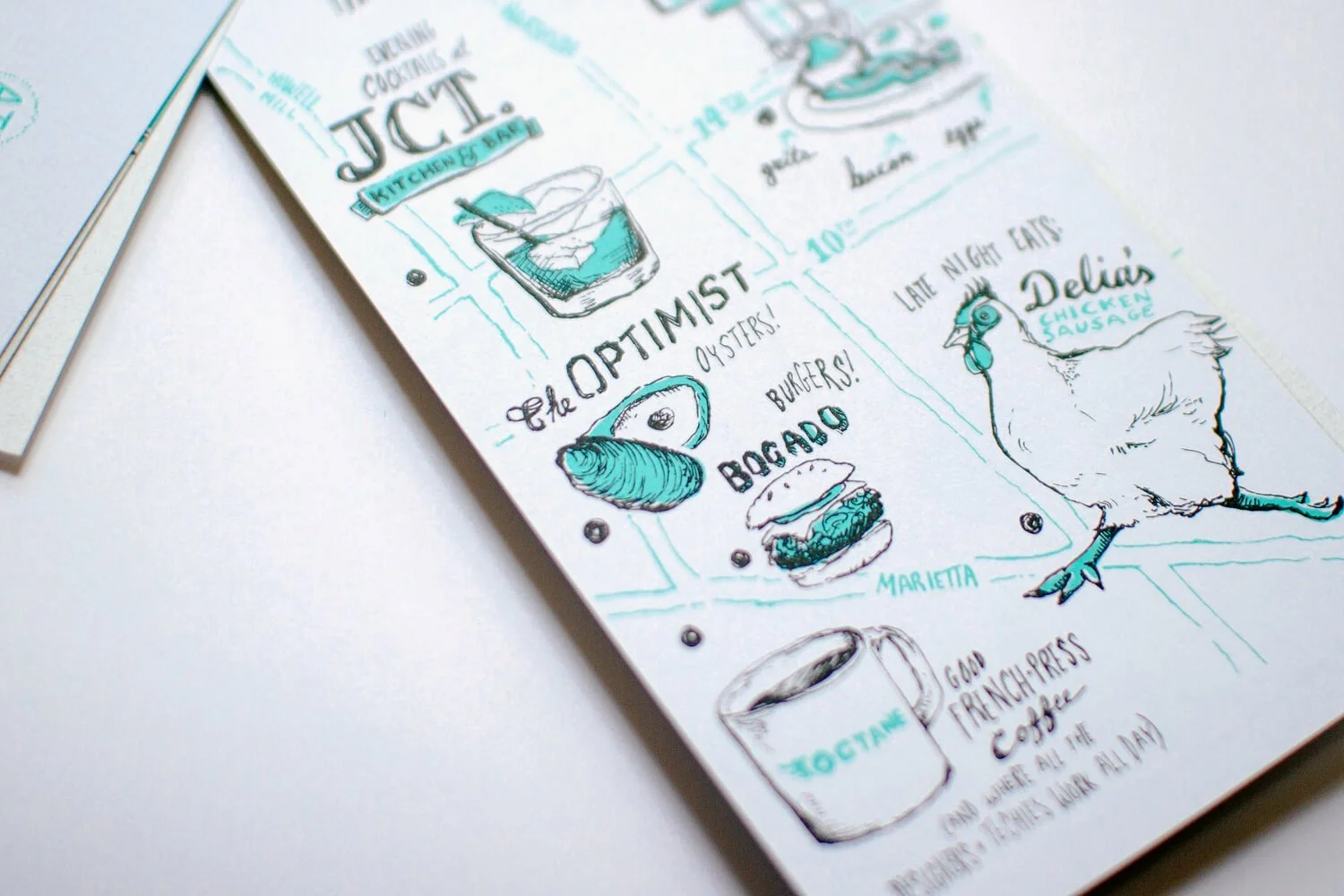 The illustrated food guide was done in my loose, pen-and-ink style of drawing which I felt represented the folk-arty imperfection and quality of our Southern-gothic yet modern vibe. It was produced on an eight-page flyout that works as an insert that is removable from the spread of the book.