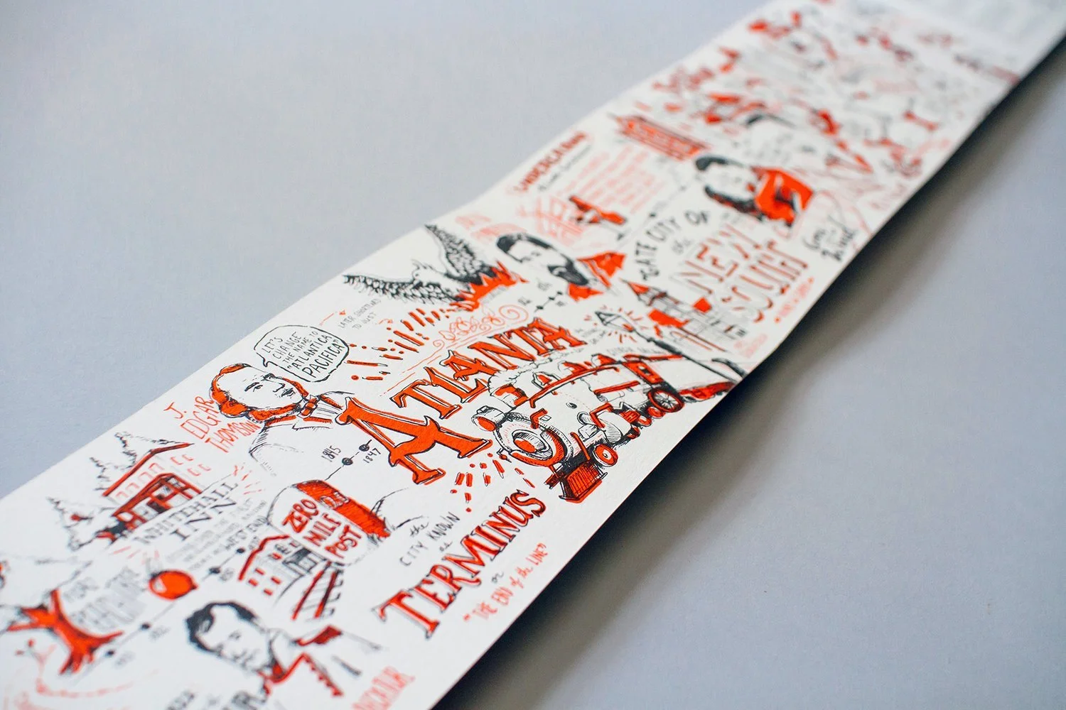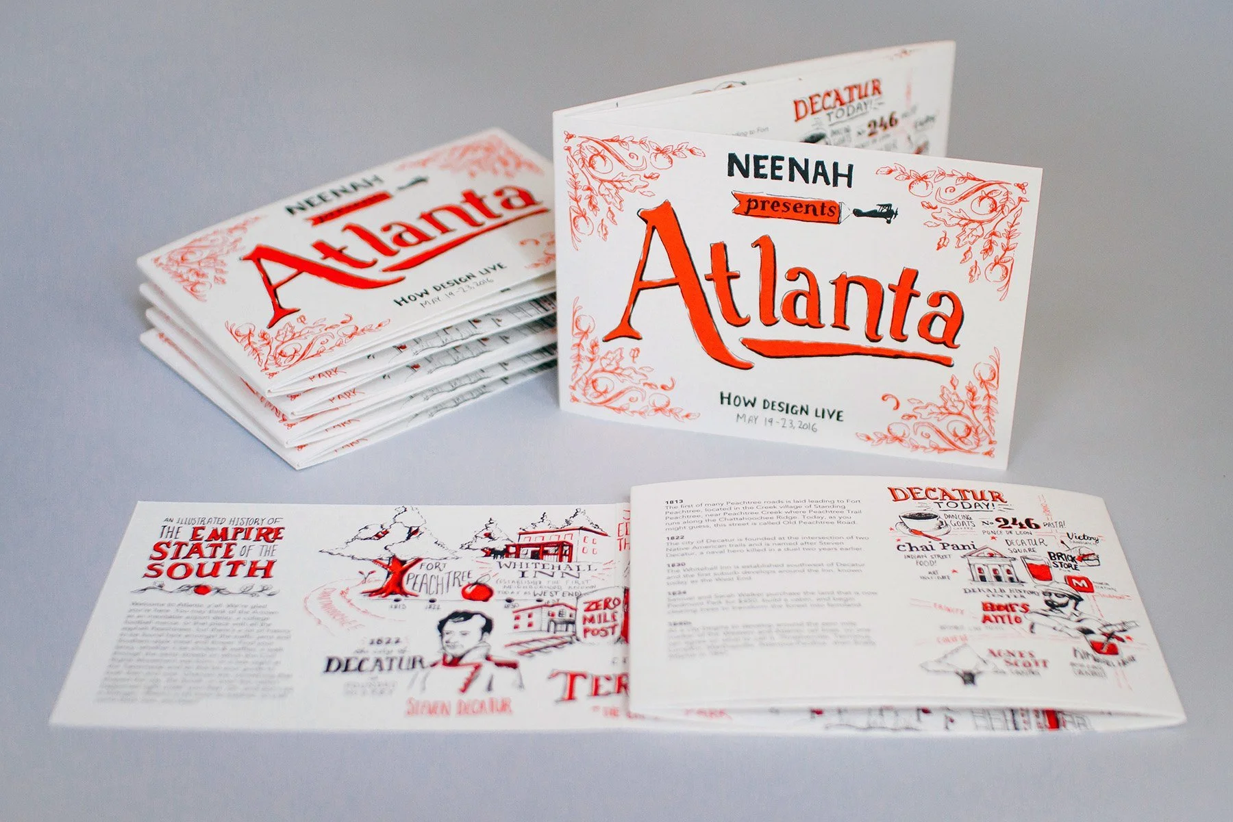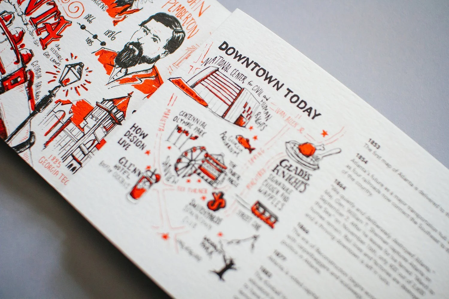 Following the New Orleans with Neenah illustrated maps for use at the 2015 AIGA Conference, Neenah Paper commissioned another illustration in the series for their next conference: HOW Design Live 2016 in Atlanta. This rolling fold, printed piece takes the reader through the past and present of the Big Peach. As each panel is opened, an immersive, illustrated timeline of the history of the city is revealed, with the corresponding panel opposite the timeline detailing dates and events and featuring a map highlighting how that area has changed from then to today.