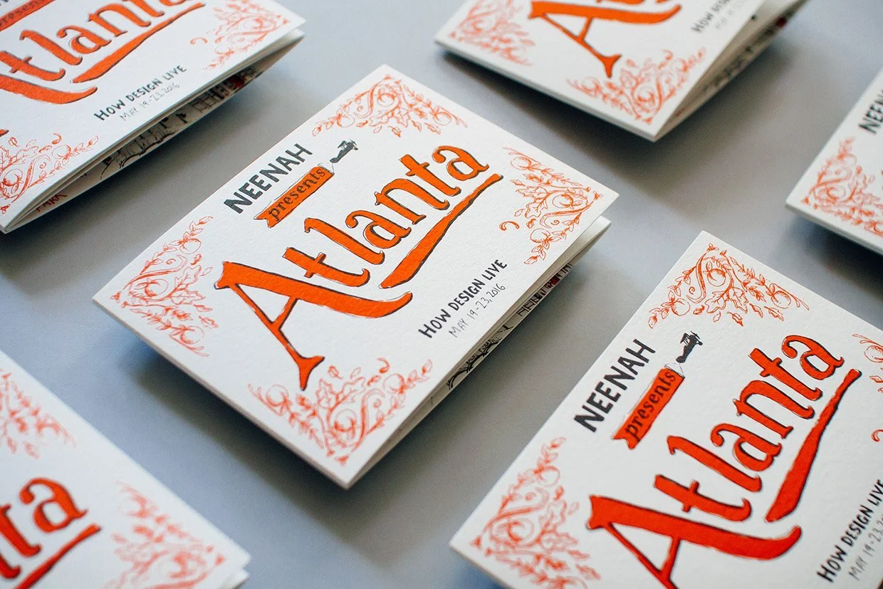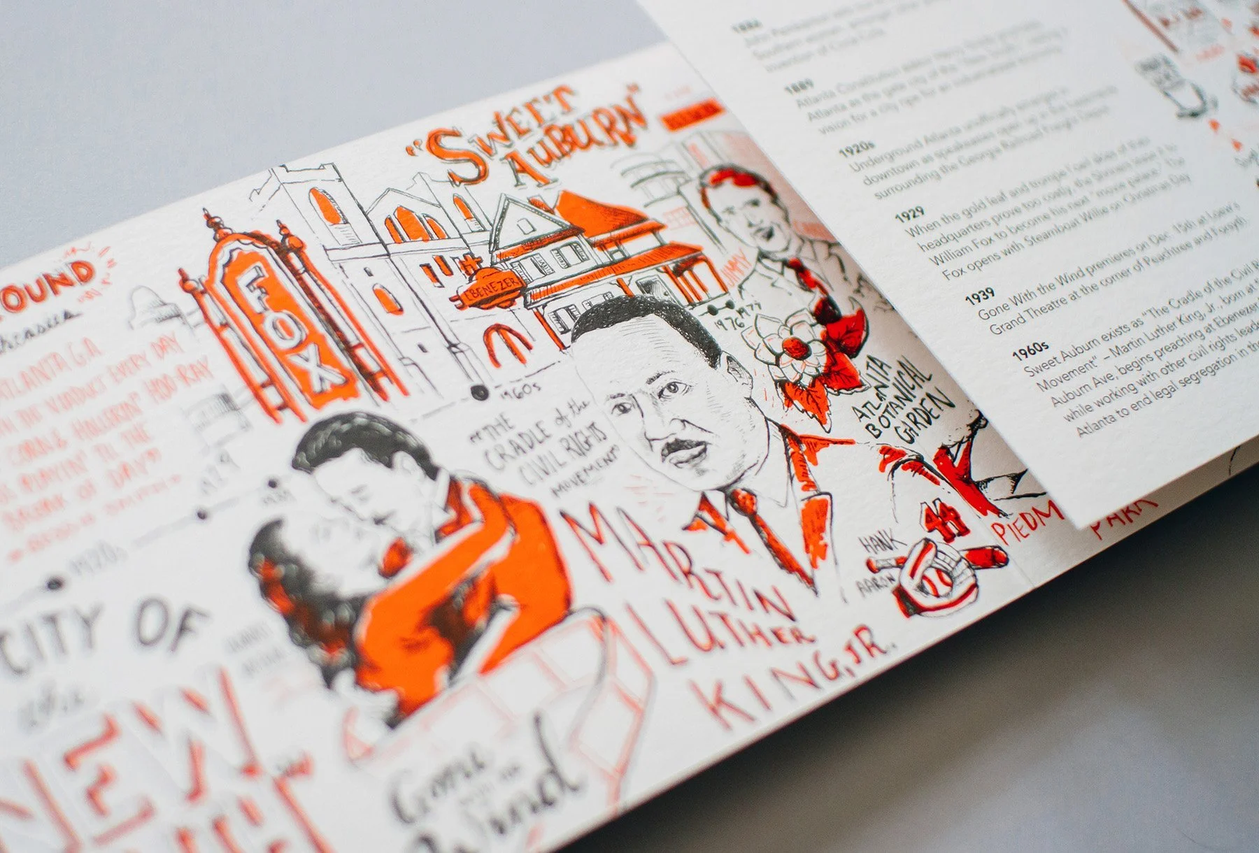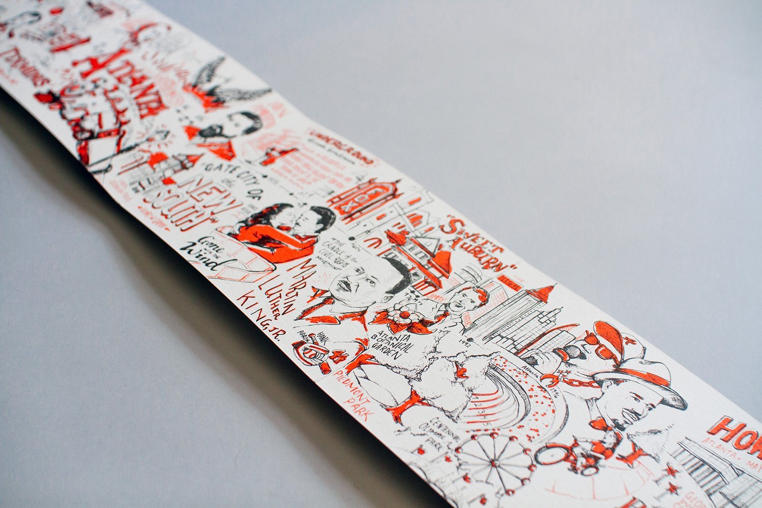 Following the New Orleans with Neenah illustrated maps for use at the 2015 AIGA Conference, Neenah Paper commissioned another illustration in the series for their next conference: HOW Design Live 2016 in Atlanta. This rolling fold, printed piece takes the reader through the past and present of the Big Peach. As each panel is opened, an immersive, illustrated timeline of the history of the city is revealed, with the corresponding panel opposite the timeline detailing dates and events and featuring a map highlighting how that area has changed from then to today.