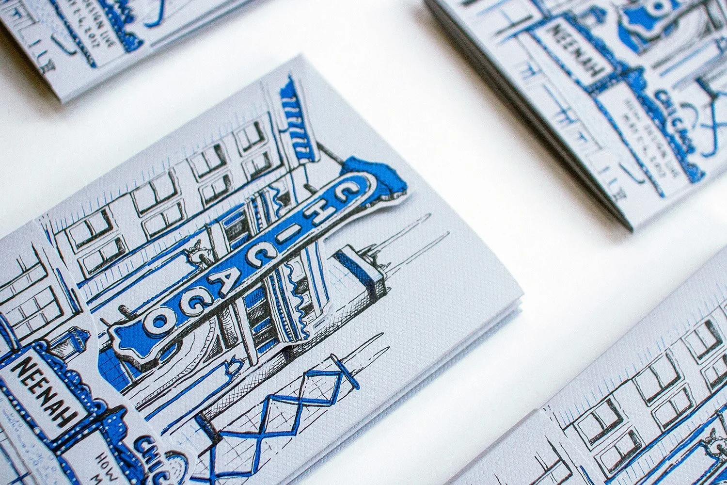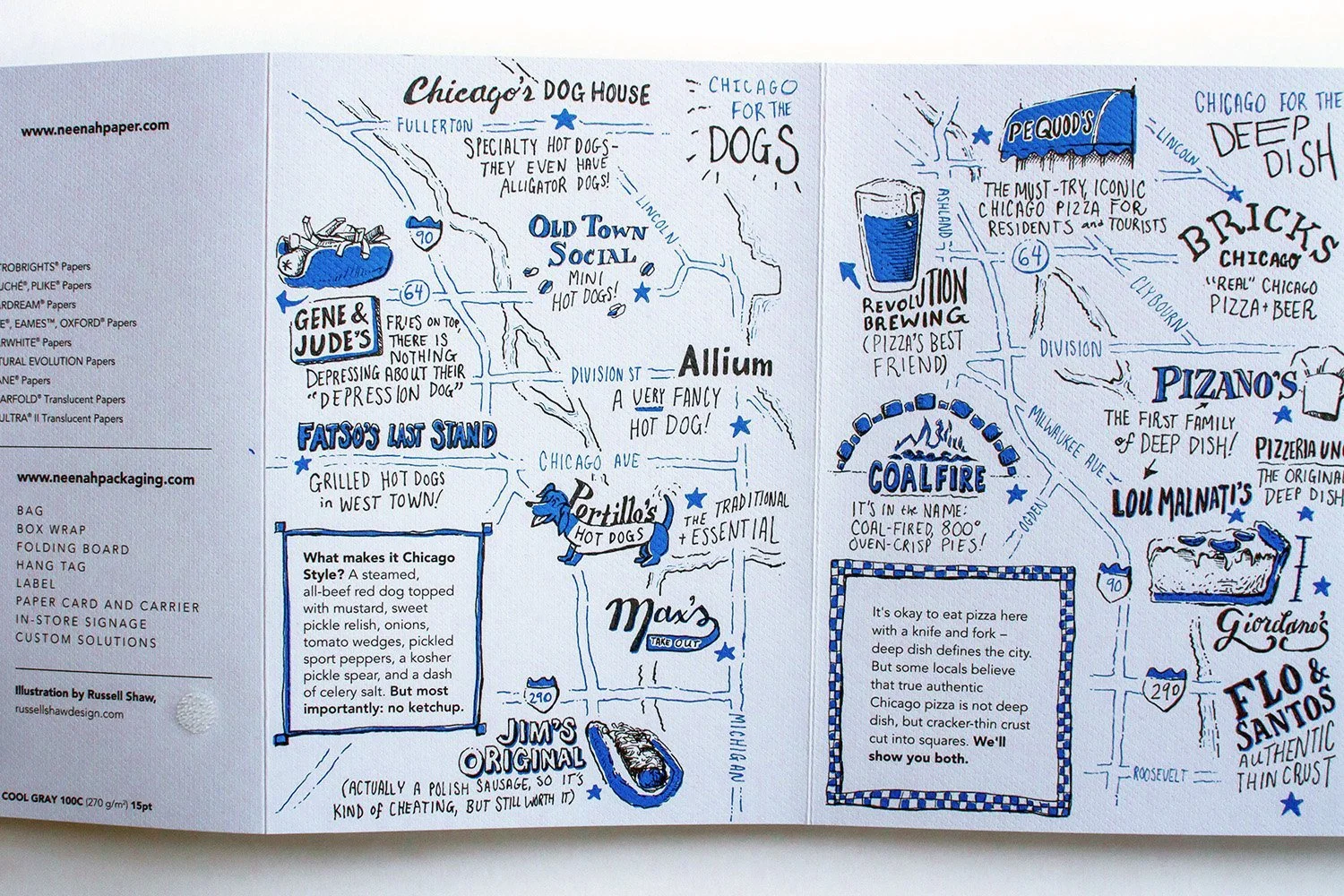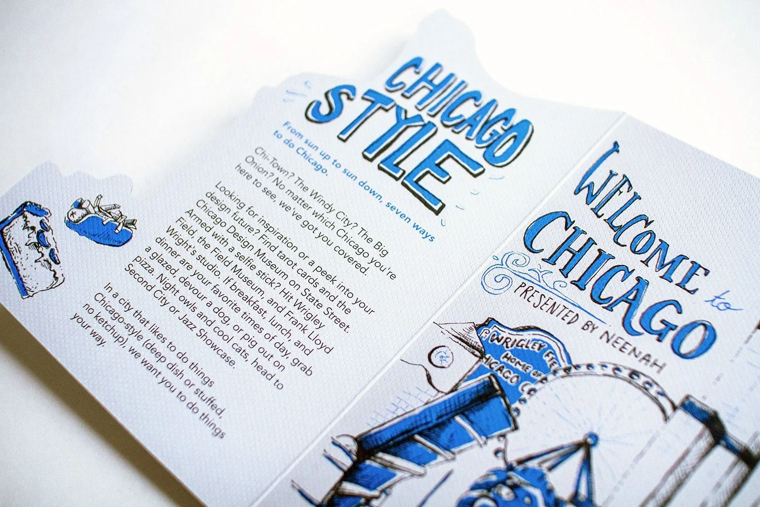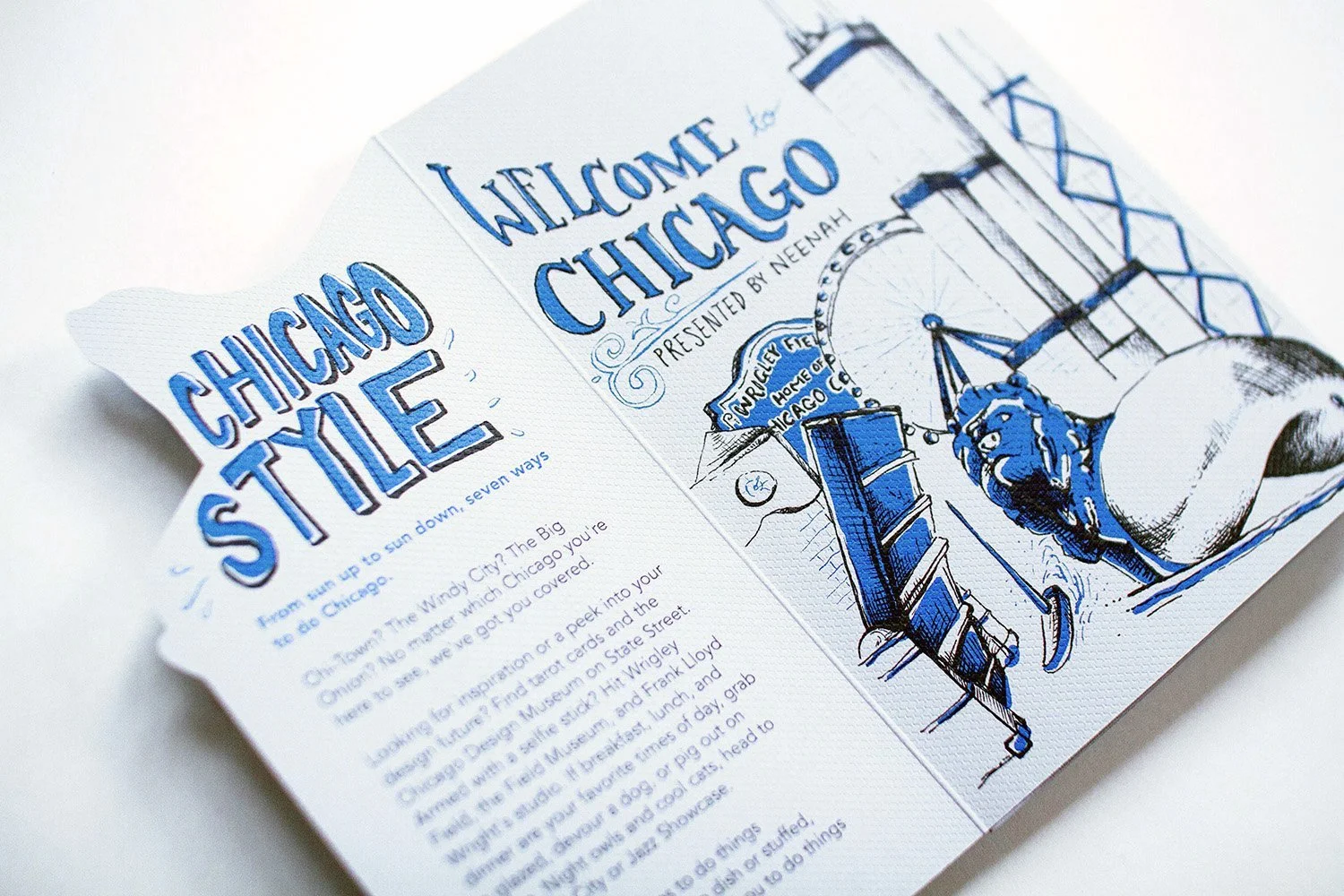 Following the previous city guides in our series, New Orleans with Neenah (2015 AIGA Conference) and Neenah Presents Atlanta (2016 HOW Design Live; PRINT Magazine's 2017 Typography and Lettering Awards "Best in Class" Winner), Neenah Paper commissioned me to create another illustrated giveaway for HOW Design Live 2017 in Chicago. This accordion fold, limited edition piece takes the viewer through seven different maps of Chicago, each with a different lens through which he or she can experience the Windy City – from seeing Chicago as a designer, to experiencing the city on the hunt for the best pizza. The print piece was distributed to conference goers as a promotional piece.