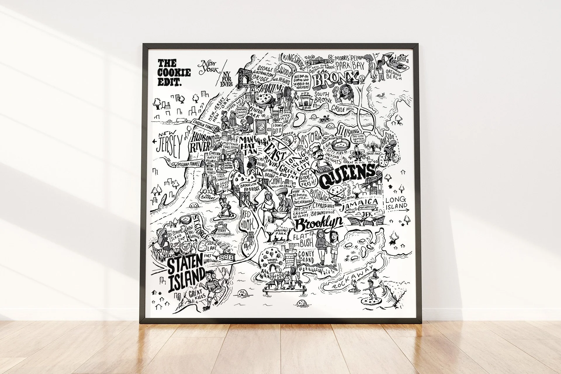 In the height of the pandemic, New York Magazine partnered with NYForever to create The Cookie Edit: a limited-edition curated box of 12 cookies from around the 5 boroughs with all proceeds benefitting ROAR, an organization helping the city’s restaurant workers. New York commissioned me to create a limited-edition, hand-illustrated, black and white print featuring a jam-packed map of New York City full of hand-lettering, city-dwelling characters, and plenty of cookie references (of course) throughout.