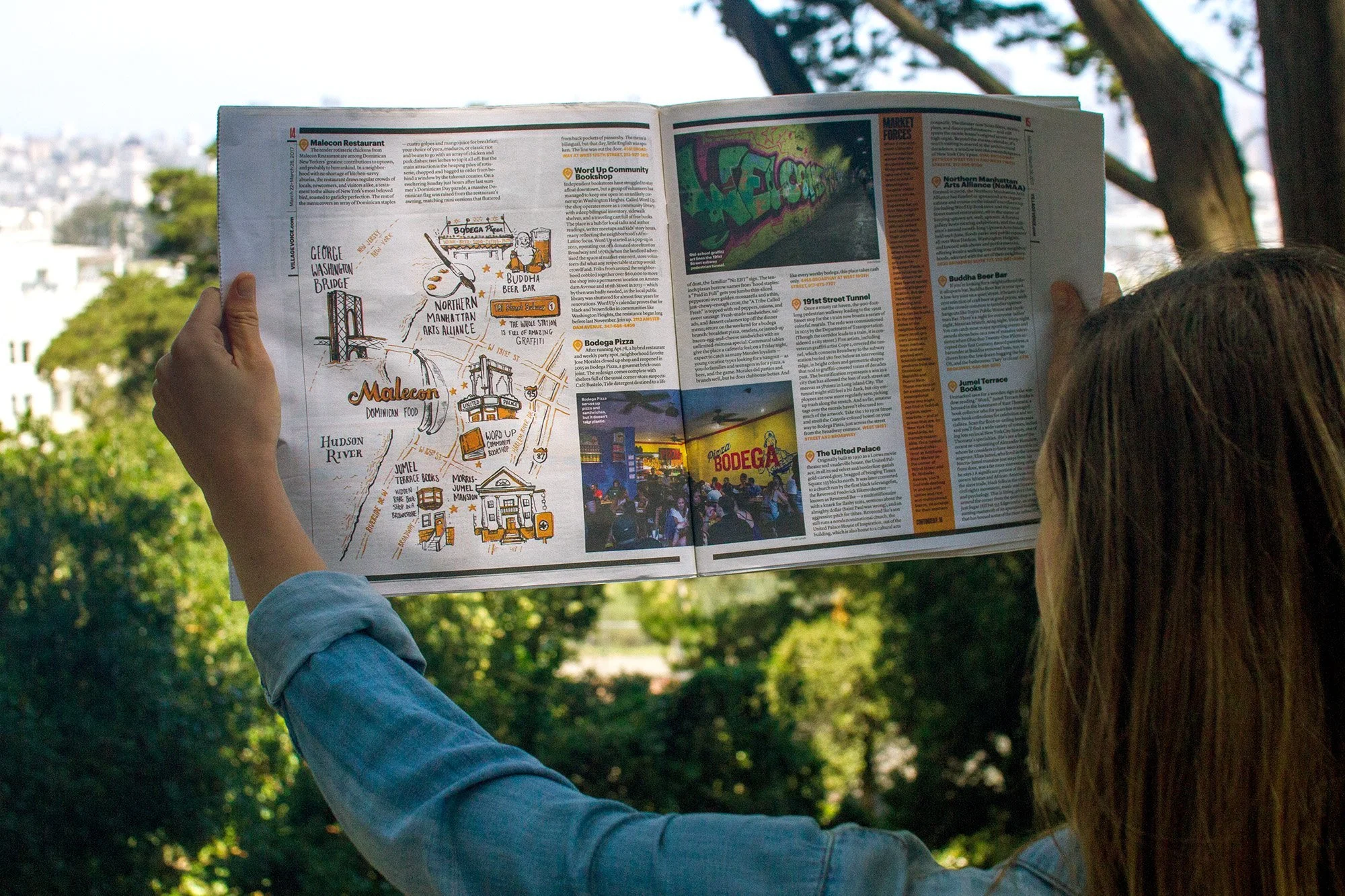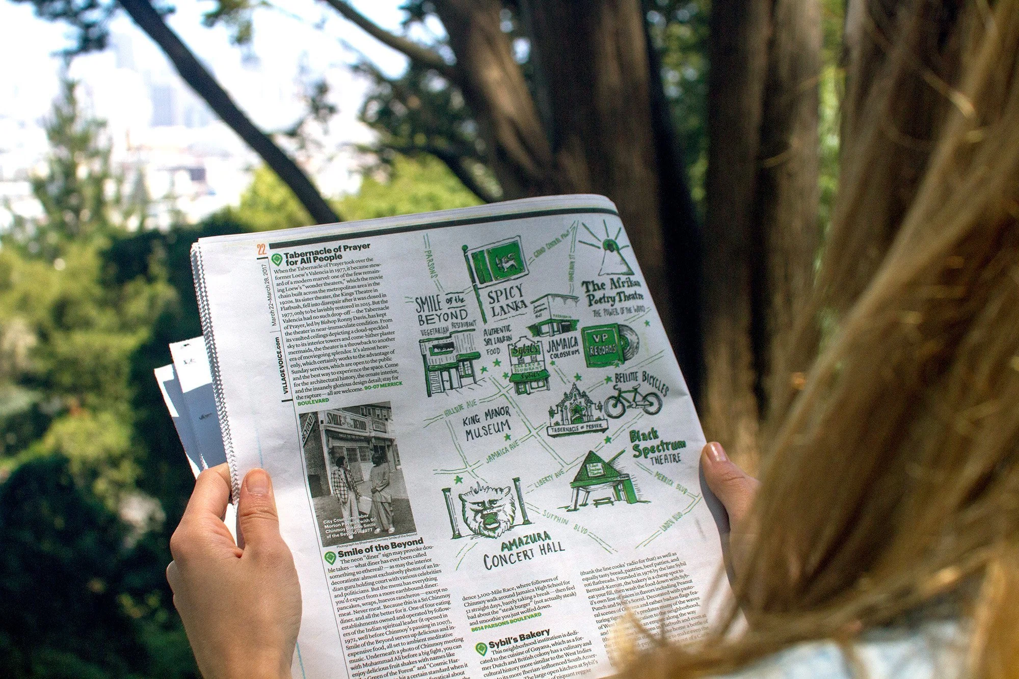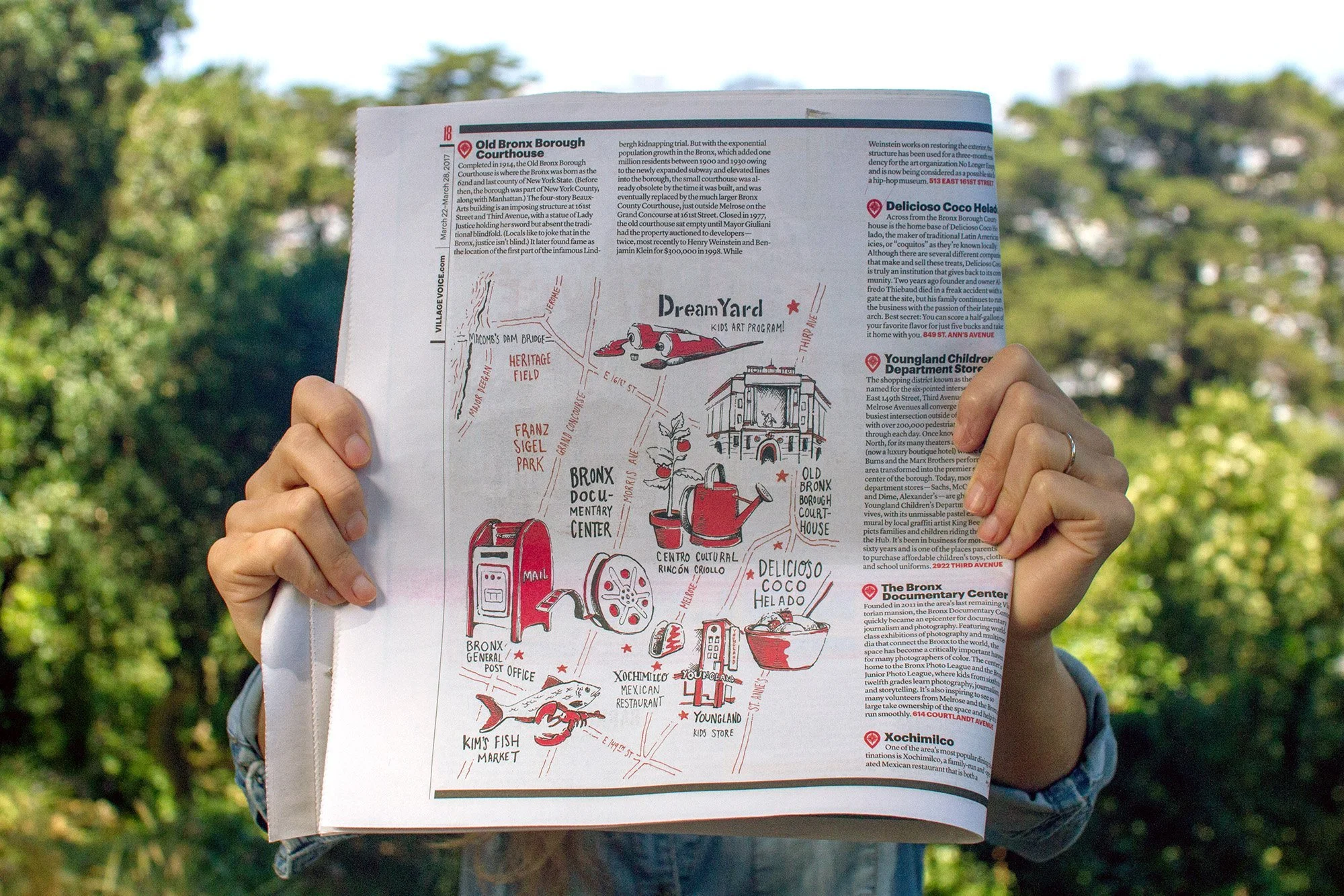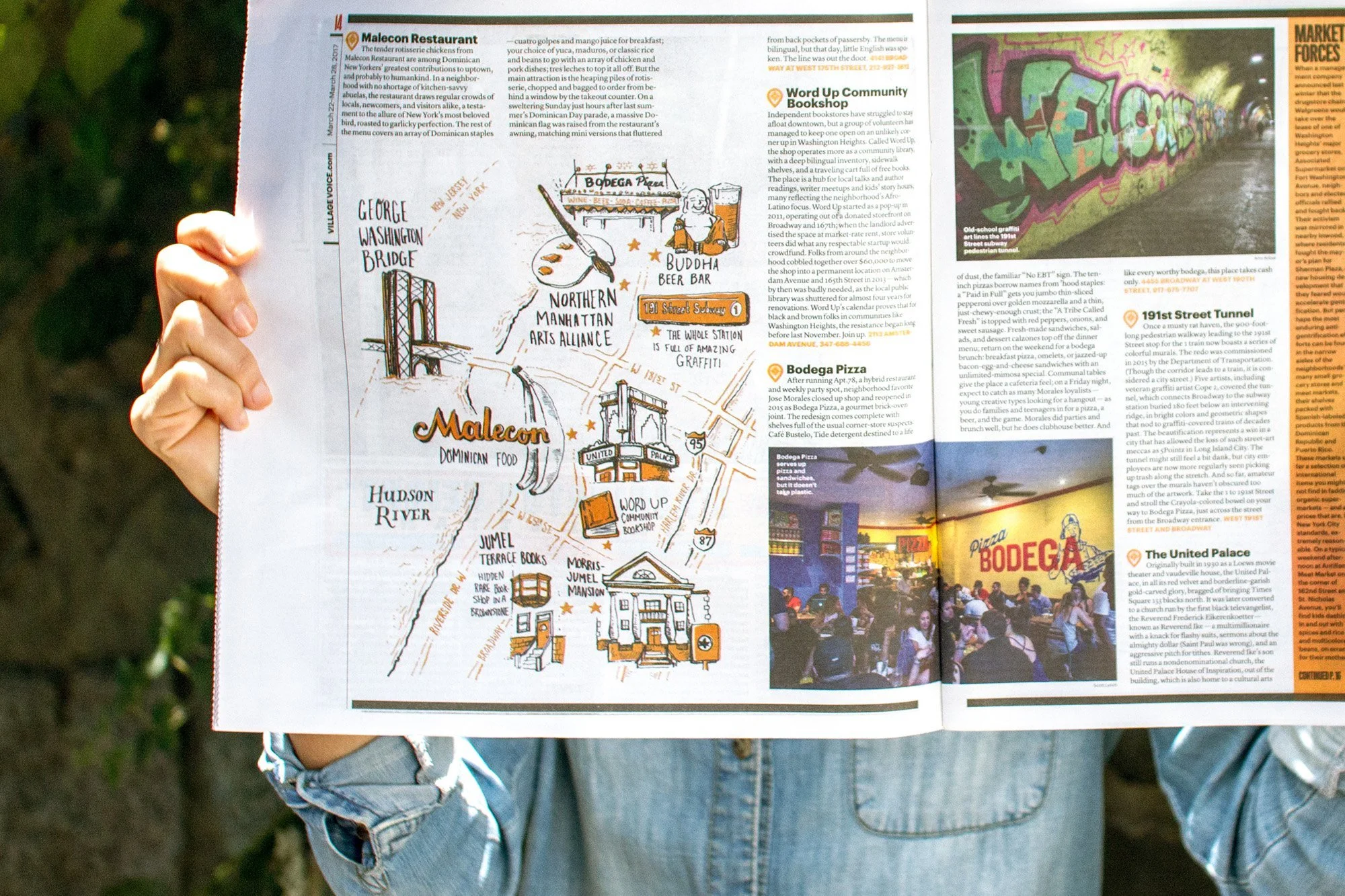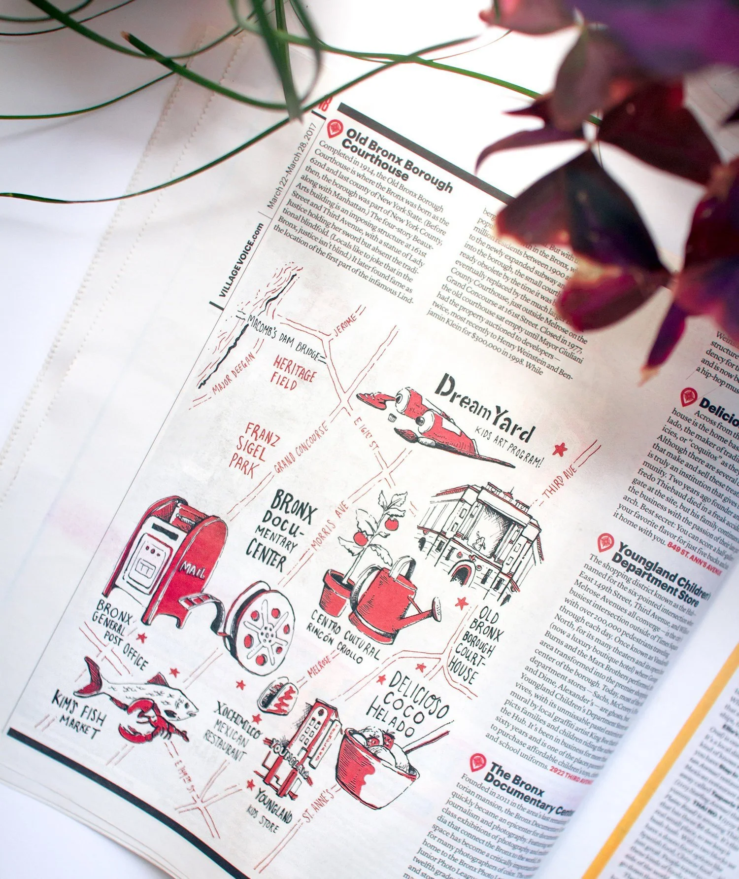 I was approached by the art directors at The Village Voice to create a series of five illustrated maps for one of their upcoming issues. They reached out with my specific artwork style already in mind: black ink, plus one spot color, hand-drawn illustrated maps. Each map would spotlight a different New York City neighborhood – a true locals' guide to places that are off-the-beaten path.